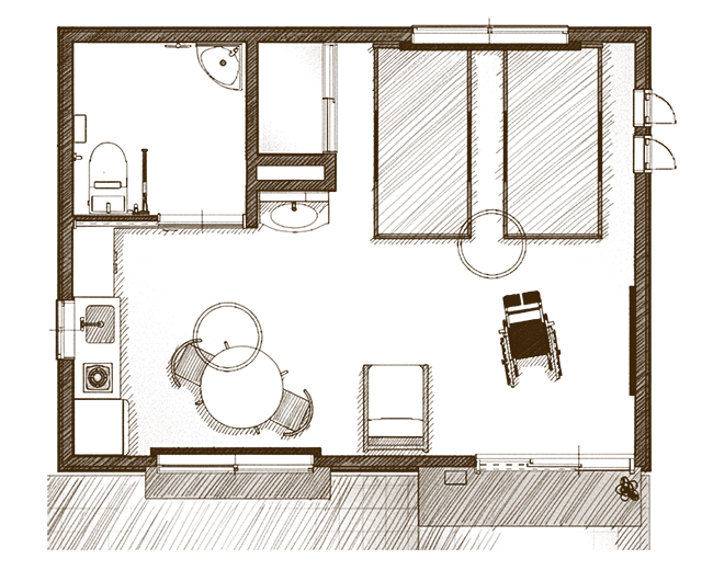 おひとり様用の単棟の場合には、介護用ベッド1台と洗面、簡易トイレを。